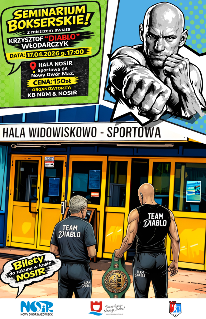 Nowodworski Ośrodek Sportu i Rekreacji zaprasza na wyjątkowe wydarzenie sportowe — seminarium bokserskie z mistrzem świata Krzysztofem „Diablo” Włodarczykiem, które odbędzie się 17 kwietnia 2026 r. o godz. 17:00 w Hali NOSiR przy ul. Sportowej 66.