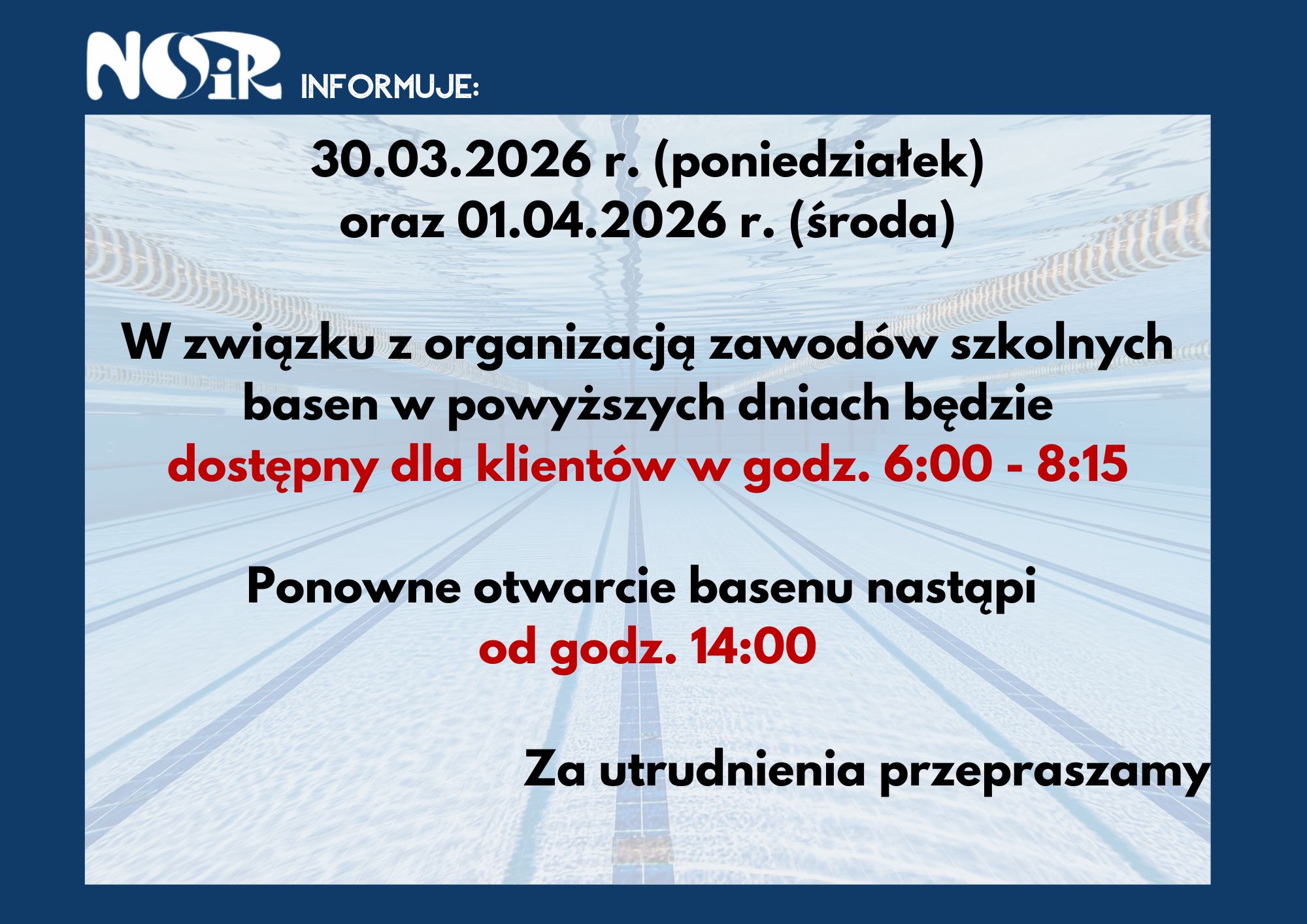 w związku z organizacją zawodów szkolnych, basen będzie dostępny dla klientów wyłącznie w godzinach 6:00 – 8:15.